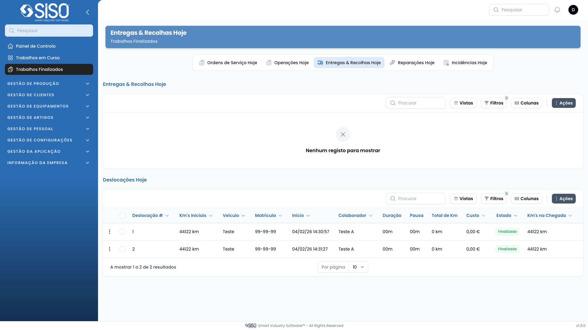 This page provides a detailed view of finished today retrievals and deliveries. It allows users to view, filter, and export details related to these activities.