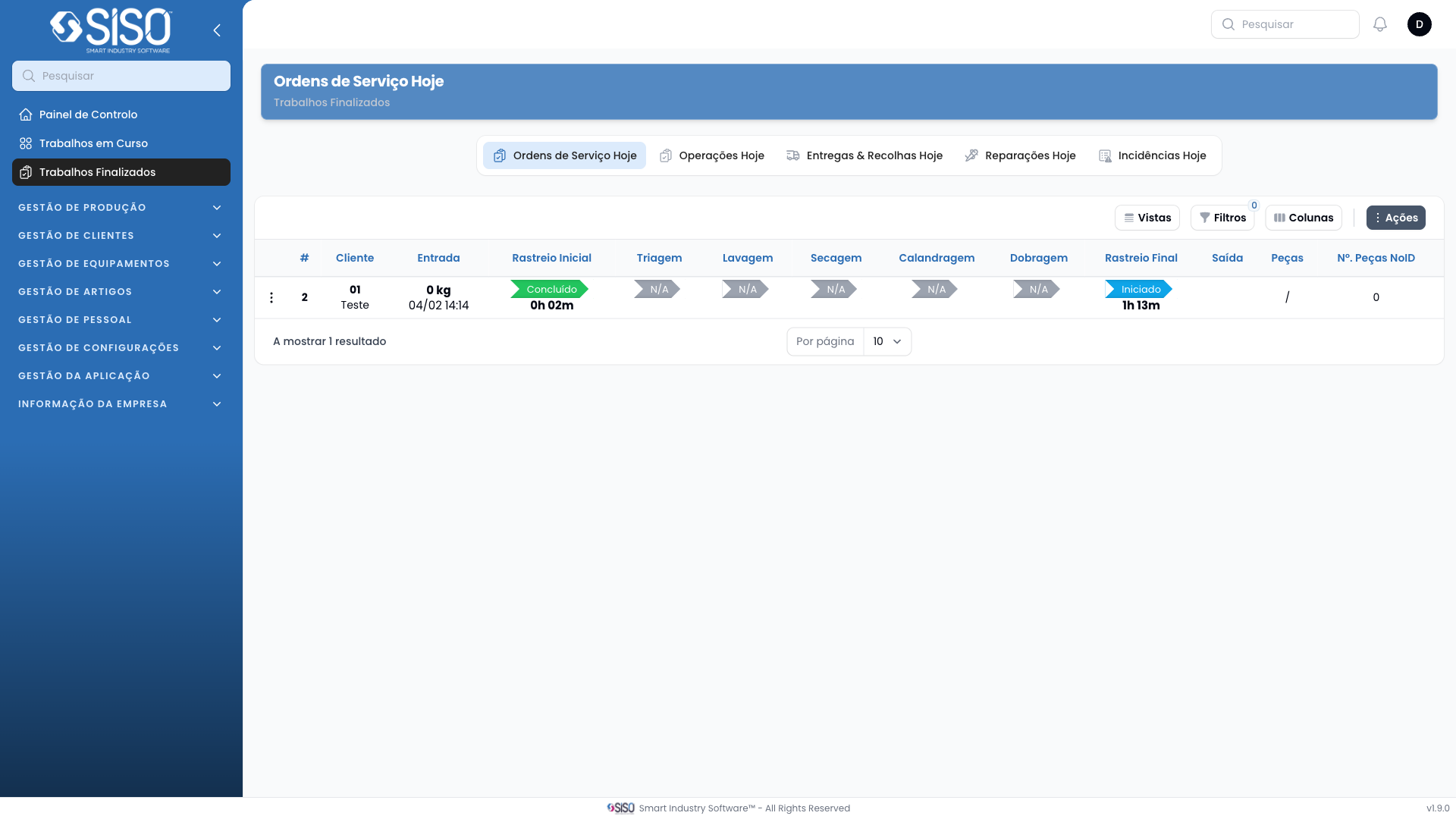 | Rastreio | Tracking status and duration for the work order |
