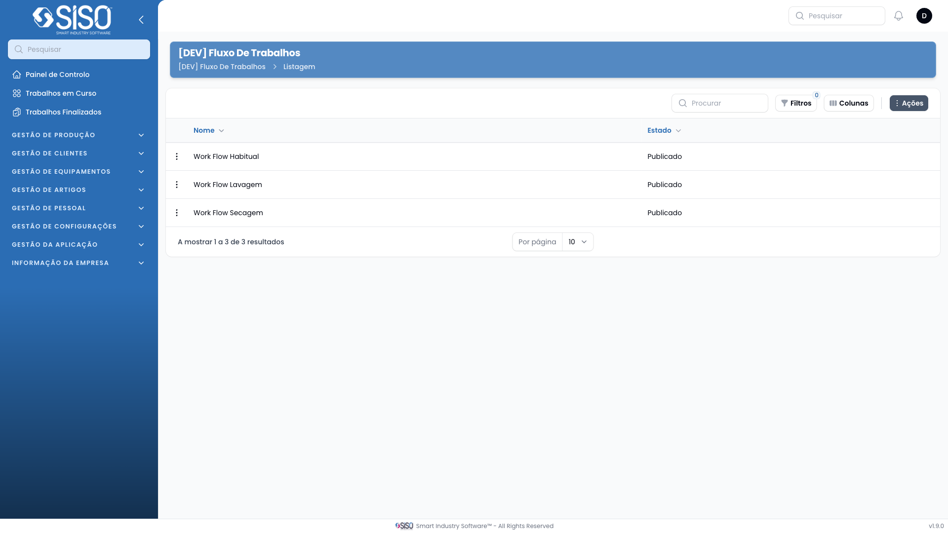 The table displays a list of all the work flows created in the system. Each row represents an individual work flow with details such as the name and its current status.