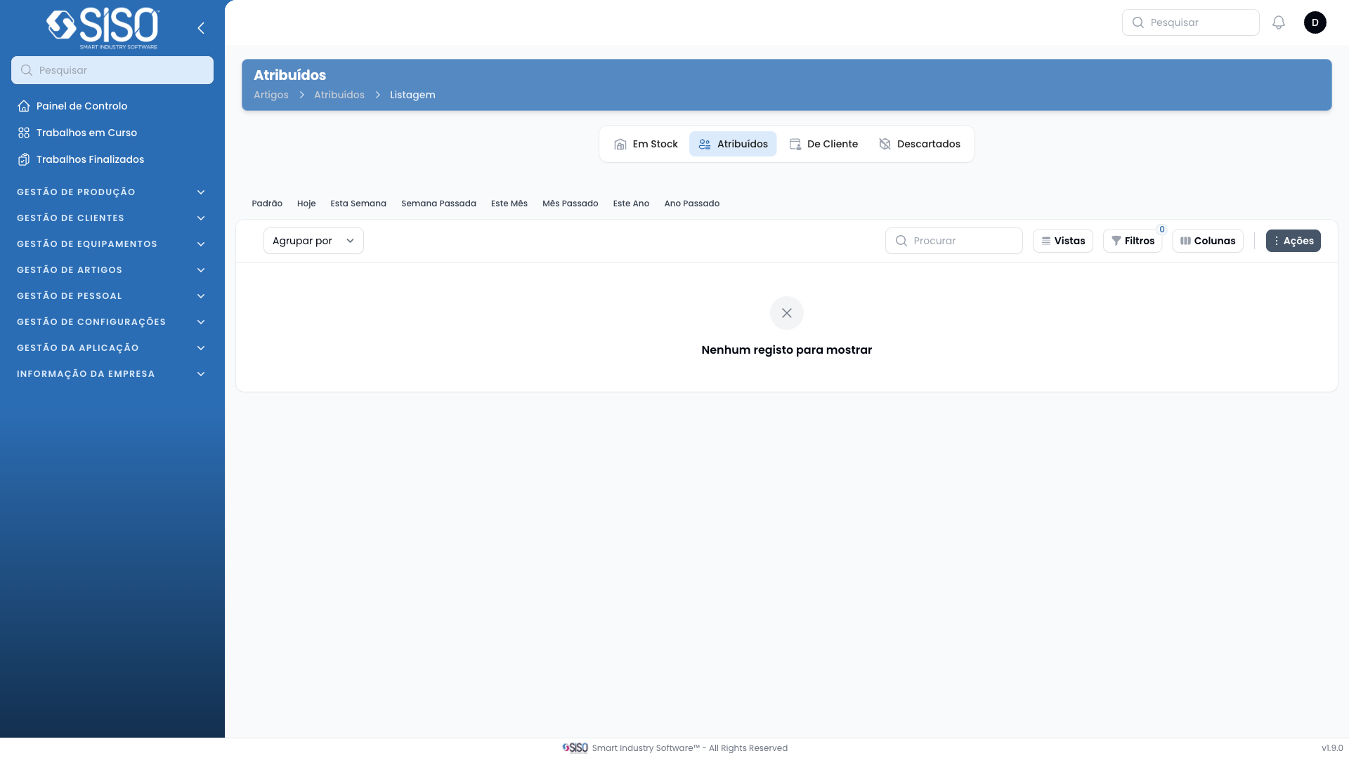 The table lists all the assigned articles with detailed information about each item, including the client, delivery address, and employee responsible for the item. The table also offers several actions and filters to manage the records effectively.