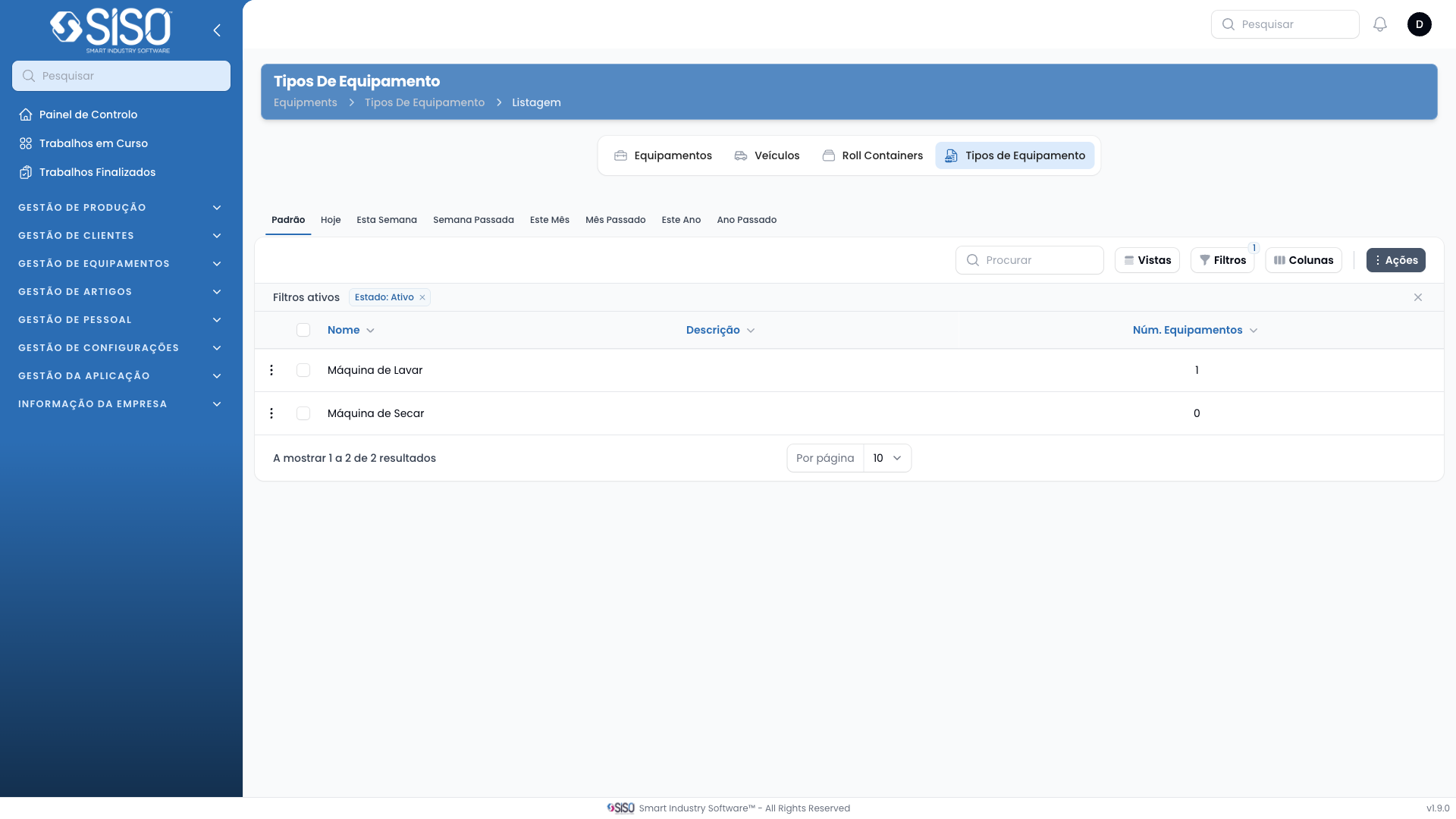 • Status: Filter the equipment types by their status (Active, Inactive, or All).